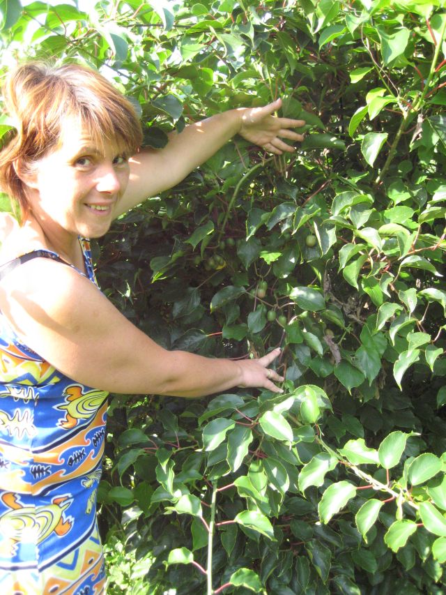Jetzt, im ausklingenden Sommer, leuchten Mädchenauge und Sonnenbraut, Fette Henne und Astern, Glockenblumen und Herbstzeitlose in den Beeten. Frühlingsblüher wie Narzissen, Primeln und Schlüsselblumen machen im Juni Platz für Storchschnabel und Rosen, Phlox und Pfingstrosen. Aber auch Hortensien, Funkien, Zierahorn und Blauregen fehlen nicht. Zurzeit warten Pflaumen, Birnen, Heidelbeeren, Brombeeren, Trauben und sogar Kiwis (Foto oben) darauf, geerntet zu werden. Insgesamt etwa 200 Meter selbst gezogene Buchshecken säumen die Wiese; unter einer riesigen Buche umfasst eine schattige Bank den dicken Stamm.